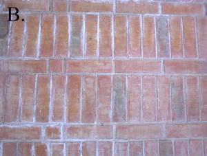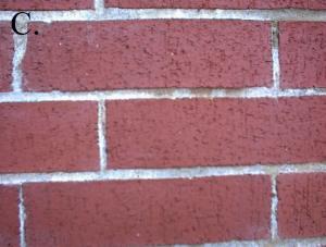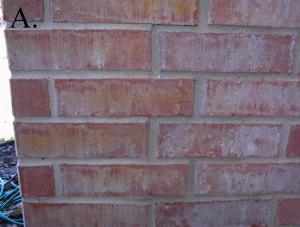 | The color that you are seeing could possible be acid burn. This is caused by improper use of the cleaning agent that was used to clean your home. If not mixed correctly, rinsed thoroughly or used properly, a stain can be left on the brick and mortar. Some examples of acid burn are shown in the pictures below. Pictures A and B show the effects of acid burn on bricks. Picture C shows the affects of acid burn on mortar. |