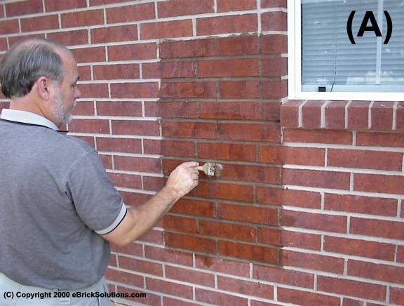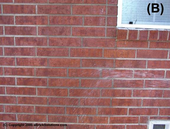 | The water repellant is keeping the SureKlean from coming in contact with the mortar and will not work unless you remove the repellant. Determine what product was used and contact PROSOCO customer service for their chemical recommendation. In most cases, the product to use is Dicone NC15 Gel by PROSOCO. In picture A above, the Dicone removed about 75% of repellant and allowed for final cleanup. The material was applied and left on for one hour, taking care not to allow to dry on wall. It was pressure rinsed thoroughly with 1000 lbs. pressure. If removal is successful, you will notice that the wall wets out when rinsed as in picture B. |