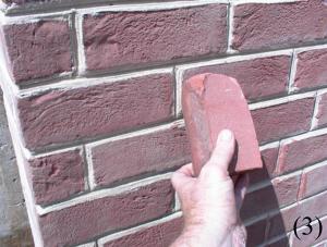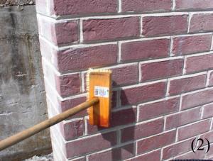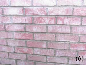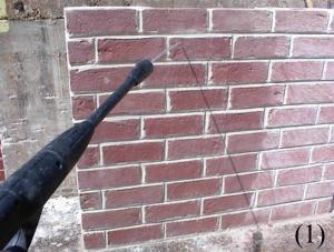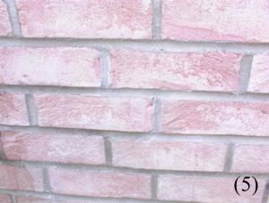 SureKlean Masonry Cleaners are manufactured by PROSOCO. 2. Pre wet wall thoroughly (picture 1). Due to the porosity of this product, an area of 6' x 6' is recommended. 3. Apply cleaning solution with a soft bristle brush (picture 2). Allow for a 3 minute dwell time on the 600 and the 101 and 5 minute on the Vanatrol. If wall starts to dry out reapply cleaner solution. Do not let cleaner dry on the wall. Always wash the bottom of the wall first to ensure that the area to be cleaned has been thoroughly moistened. 4. Use a piece of the molded brick to break up any mortar clods on the face of the brick by gently rubbing the brick (see picture 3). Do not use a wire brush or metal scraper of any kind as this will remove the sand coating. Picture 5 illustrates the damage a wire brush can do to molded brick. 5. Rinse thoroughly with clean water (see picture 4). Do not use pressure rinse, the sand coating could be removed by the pressure. Picture 6 is an example of pressure washer damage. |