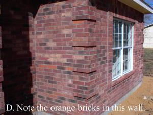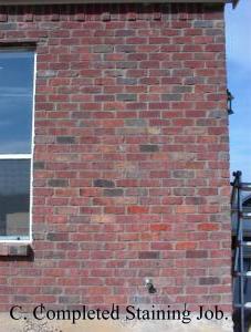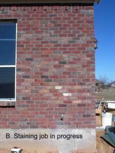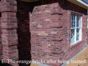 | The pictures A, B and C are an example of a staining job to repair a large number of unmatching bricks. Pictures D and E illustrate staining unmatched orange bricks to match the wall. |